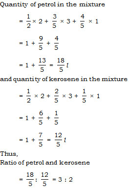 The concentration of petrol in three different mixtures (of petrol and kerosene) is  12,35    and  45   , respectively. If 2 L, 3L and 1 L are taken from these three different vessels and mixed, what is the ratio of petrol and kerosene in the new mixture –