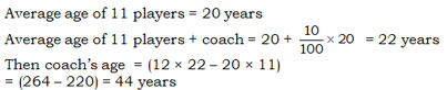 The average age of eleven cricket players is 20 years. If the age of the coach is also included, the average age increases by 10%, the age of the coach is–
