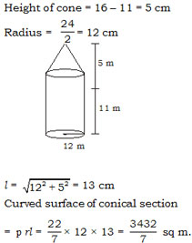 A tent is in the form of a right circular cylinder surmounted by a cone. The diameter  of the cylinder is 24 m. The height of the cylindrical portion is 11 m, while the vertex  of the cone is 16 m above the ground. What is the Area of the curved surface for conical  portion –