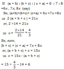 If (a + b) : (b + c) : (c + a) = 6 : 7 : 8 and a + b + c = 14, then value of c is:
