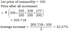 The price of a commodity increased by 5% from 2012 to 2013, 8% from 2013 to 2014 and 77% from 2014 to 2015. What is the average price increased (approx) from 2012 to 2015?