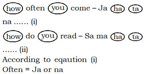 In a symbolic language, 'how often you come' is written as 'ja ha ta na' and 'how do you read' as 'sa ma ha ta', then in this language, code for 'often' is –