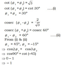 If cot (\(\theta\)1 + \(\theta\)2) = \(\sqrt{3}\) and cosec (\(\theta\)1 – \(\theta\)2) = \(\cfrac{2}{\sqrt{3}}\), then the value of (cos 2\(\theta\)1 + cot 3\(\theta\)2) is –