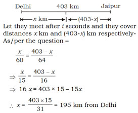 Delhi and Jaipur are 403 km apart. An express bus leaves Delhi for Jaipur at 5 am and runs at an average speed of 60 km/hr. Another delux bus leaves Jaipur for Delhi at the same time and runs at an average speed of 64 km/hr. Where will the two buses meet ?