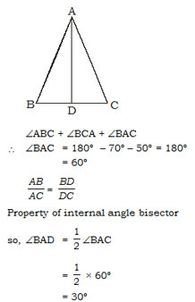 In a \(\Delta\)ABC, \(\cfrac{AB}{AC}\) = \(\cfrac{BD}{DC}\) , \(\angle \)B = 70º and \(\angle \)C = 50º, Where point D is a point on BC, then \(\angle \)BAD = ?