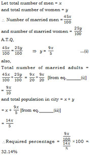 Of the adult population in a certain city, 45% of men and 25% of women are married. Assuming that no man marries more than one women and vice versa, the percentage of total population of adults who are married, is