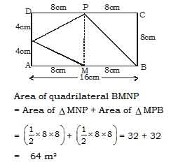 The side of a rectangle ABCD, AB = 16 cm and AD = 8 cm. M, N, P are the mid points of side AB, AD and DC respectively. The area of quadrilateral formed by joining B,N, M, P is