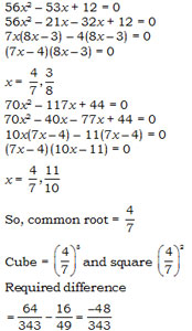 What is the difference of the cube and square of the common root of 56x2 – 53x + 12 = 0 and 70x2 – 117x + 44 = 0?