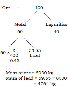 The percentage of metals in a mine of lead ore is 60%. Now the percentage of silver is  34%    of metals and the rest is lead. If the mass of ore extracted from this mine is 8000 kg. the mass (in kg) of lead is  –