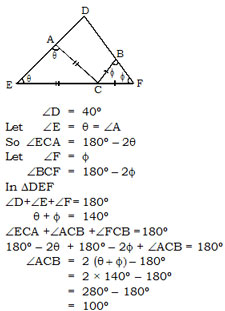 In triangle DEF shown in given fig, points A, B and C are taken on DE, DF and EF respectively.  Such that EC = AC and CF = BC. If angle D = 400, then what is angle ACB in degress?