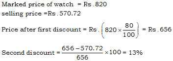 The marked price of watch was Rs.820. A man bought the watch for Rs.570.72 after getting two successive discounts, of which the first was 20%. The second discount was –