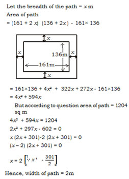 A rectangular field is 161m long and 136 m wide. There should be a path all around a field of equal width. If the area of path is 1204 m2, then the width of path is