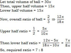 A spherical ball is covered with two colours blue and orange. The ratio of area covered by blue and orange colours on the whole ball is 2:3. The ratio of area for blue and orange colours on the upper part of the ball is 1:2. Find the ratio of area covered by blue and orange colours on the lower half.