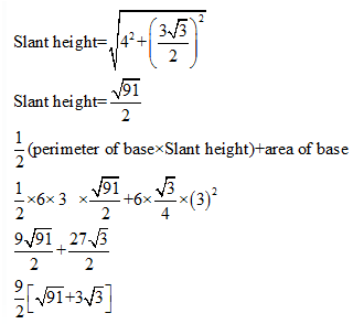 The inradius of the base hexagon won't be its side(ie 3), it'll be the height of the equilateral triangles forming the hexagon. So, [sqrt(3)/2]*3. and then this value will be used to figure out the slant height.