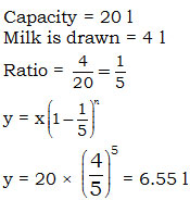 A container has a capacity of 20 l and is full of milk. 4 l of milk is drawn out and container is again filled with water. This process is repeated 5 times. Find out how much milk is left in the mixture finally?