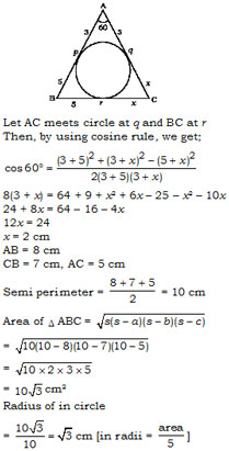 A circle is inscribed in a triangle ∆ABC. It touches side AB at point X. If A=60°, AX=3 cm, BX=5 cm, then find the radius of circle?