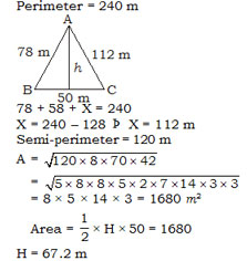 The perimeter of a triangular field is 240m . If two of its sides are 78 m and 50 m, then what is the length of the perpendicular on the side of length 50 m from the opposite vertex ?   –