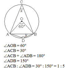 The angle subtended by a chord at its centre is 60°, then the ratio of angle subtended at its bigger arc and smaller arc is —