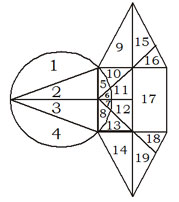 There are 19 triangles in the given figure – 2, 3, 9, 10, 15, 16, 14, 18, 19, (2, 3), (5, 10), (6, 11), (7, 12), (8, 13), (15, 16), (18, 19), (9, 15, 16), (14, 18, 19) and (6, 7, 11, 12)