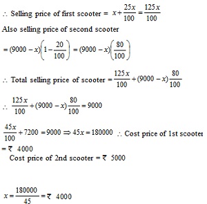 If I bought two old scooters for \(\unicode{x20B9} \)9,000. By selling one at a profit of 25% and the other at a loss of 20%, we neither gain nor losses. The cost of each scooter is: