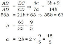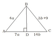 In the ABC, BD bisects \(\angle \)B and is perpendicular to AC. If the lengths of the sides of the triangle are expressed in the terms of a and b, find the value of a and b.