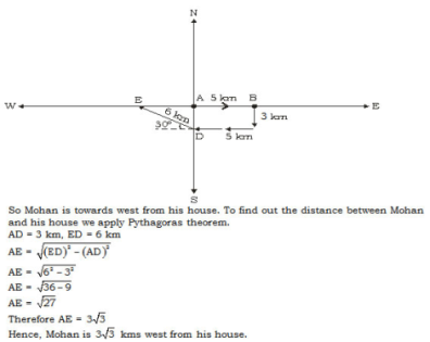 Mohan started from his home and stated walking East. After walking a distance of 5 km, he turned to the right and walked 3 km. He then again turned to the right and walked 5 km. After this he turned 30ยบ to his right and convers 6 km. In which direction is he and how far is he from his house?