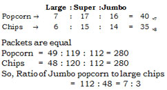 In question it is asked to compute the ratio of jumbo popcorn packets and large chip packets