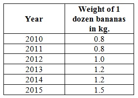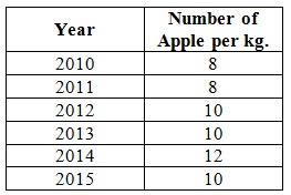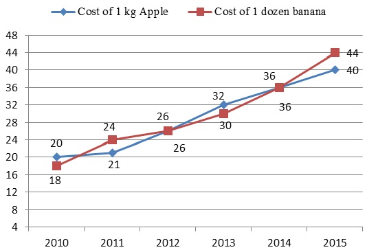 DIRECTIONSSee the following graph and answer the questions on the basis of given information. Following line graph shows the cost of 1 kg. of apple and 1 dozen of banana in various years from 2010 to 2015.