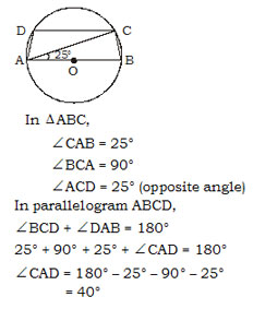 In the given figure, AOB is a diameter of the circle and CD || AB. If \(\angle \)CAB = 25°, then find the value of \(\angle \)CAD.