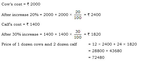 A cow and a calf cost Rs. 2000 and Rs. 1400 respectively. If the price of the cow and that of the calf is increased by 20% and 30% respectively, then the price of 1 dozen cows and 2 dozen calves is –