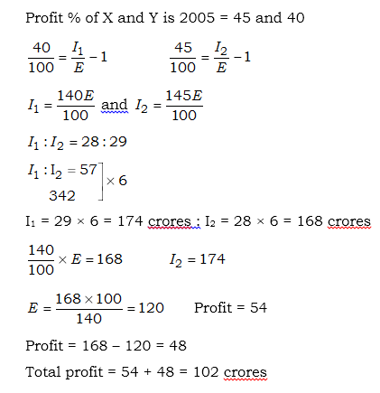 If the expenditure of company X and Y is 2005 were equal and the total income of the two companies in 2005 was Rs.342 crores, what was the total profit of the two companies together in 2005 ?