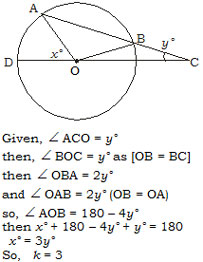 In the figure, AB is the chord of a circle with centre O. AB is extended to C such that BC = OB. The straight line CO is produced to meet the circle at D. If ACD = y° and AOD = x° such that x = ky, then the value of k is –