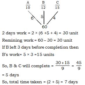 A, B and C can complete a work in 10, 12 and 15 days respectively. All three of them started together but after 2 days A left the job and B left the job 3 days before the work was completed. C completed the remaining work alone. In how many days was the total work completed?