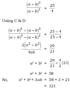 If ab = 21 and \(\cfrac{(a + b)^2}{(a-b)^2} \ = \cfrac{25}{4}\) then the value of a2 + b2 + 3ab is –