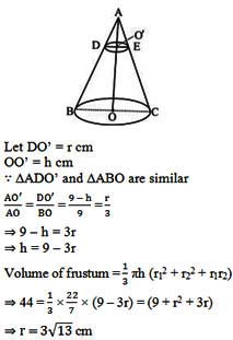 The height of a right circular cone and the radius of its circular base are 9 cm and 3 cm respectively. The cone is cut by a plane parallel to its base so as to divide it into two parts. The volume of the frustum of the cone (lower part) is 44 cm3. Find the radius of the upper circular surface of frustum.
