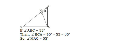Given that angle ABC = 55 degree and we know M = 90 degree therefore angle MAB = 180 - (90+55) = 35 degree