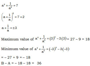 If a2 +  1a2=7    and A and B are the minimum and the maximum values of a3 +  1a3     then B – A is equal to:
