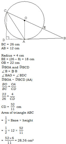 In the given figure, triangle ABC is drawn such that AB is tangent to a circle at A whose radius is 4 cm and BC passes through centre of the circle. Point C lies on the circle. If BC = 26 cm and AB = 12 cm, then what is the area of triangle ABC (in cm2)?
