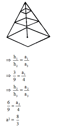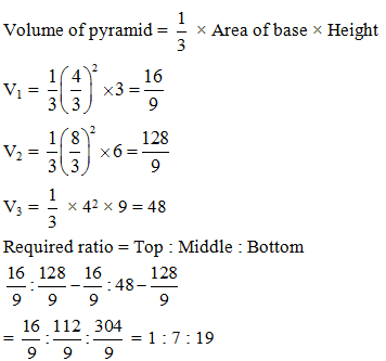 A right prism has a square base with side of base 4 cm and the height of prism is 9 cm. The prism is cut in three parts of equal heights by two planes parallel to its base. What is the ratio of the volume of the top, middle and the bottom part respectively?