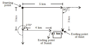 Sumit and Amit start walking from a fixed place. Sumit moves 3 km towards South and turns 270º clockwise, then walks 4 km. Amit moves towards East and walks 5 km, then turns 90º clockwise and walks 3 km. How far is Sumit from Amit?