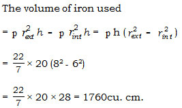 A hollow cylindrical tube 20 cm long, is made of iron and its external and internal radii are 8 cm and 6 cm respectively. The volume of iron used in making the tube is (Take \(\pi=\cfrac{22}{7}\))