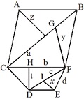 Area of \(\triangle\)BCF = \(\cfrac{1}{2}\) ay .......... (ii) Area of \(\triangle\)CFD = \(\cfrac{1}{2}\) bt .......... (iii) Area of \(\triangle\)DEF = \(\cfrac{1}{2}\) cx .......... (iv)