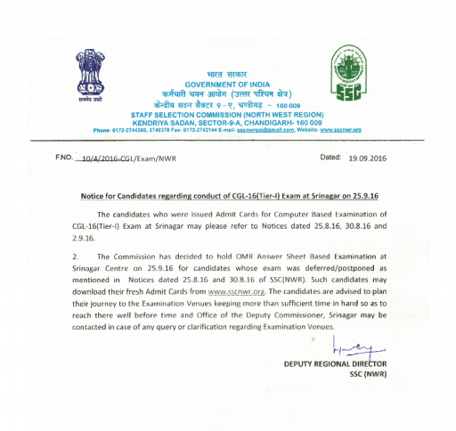 The Commission has finalized to conduct OMR sheet based examination on 25th September 2016 at Sri Nagar Centre whose examinations were postponed. Those candidates can download their admit cards from www.sscnwr.org. Please make the necessary arrangements for your journey to Sri Nagar and please make sure you reach early to settle down well before the examination starts.