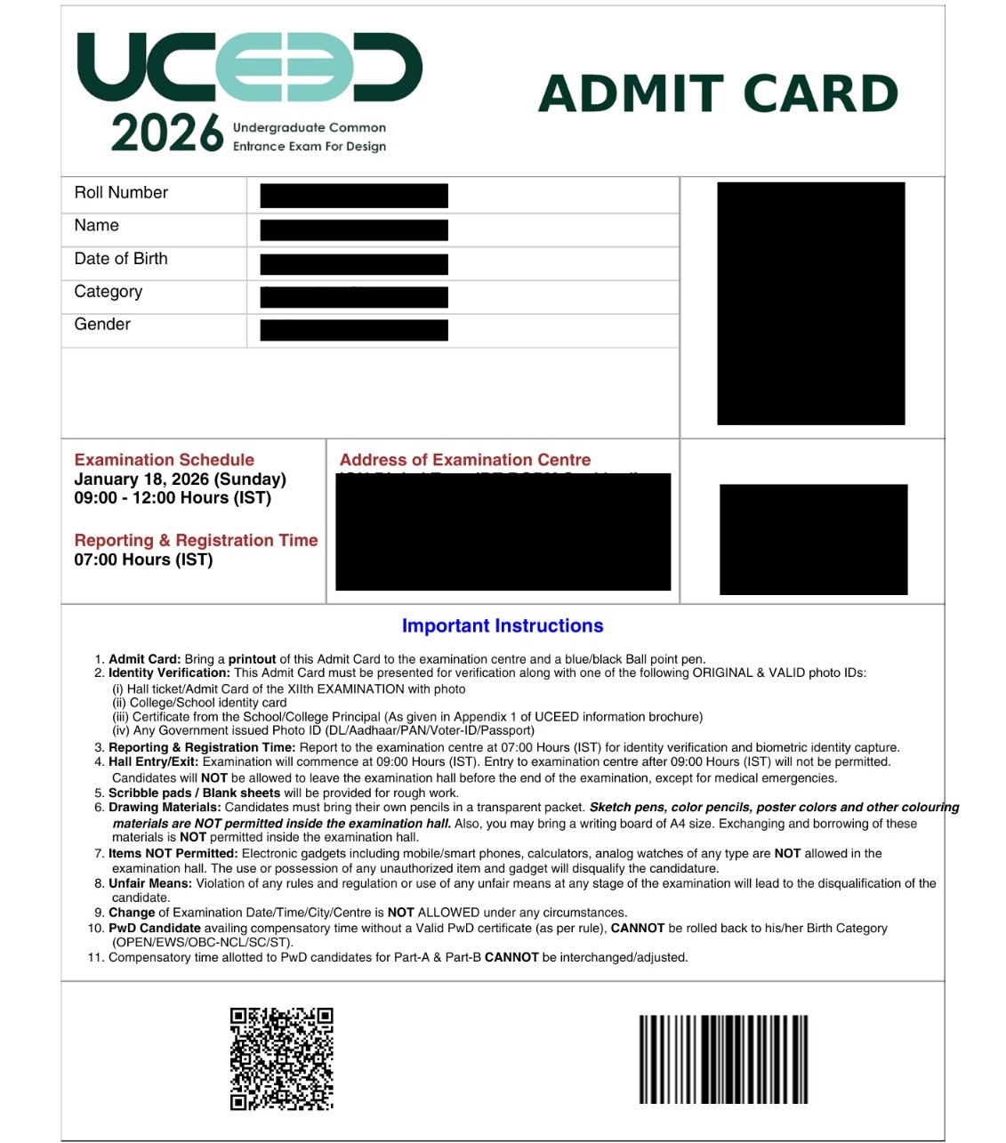 | UCEED 2026 admit card release date | January 02, 2026, 01:00 PM onwards |