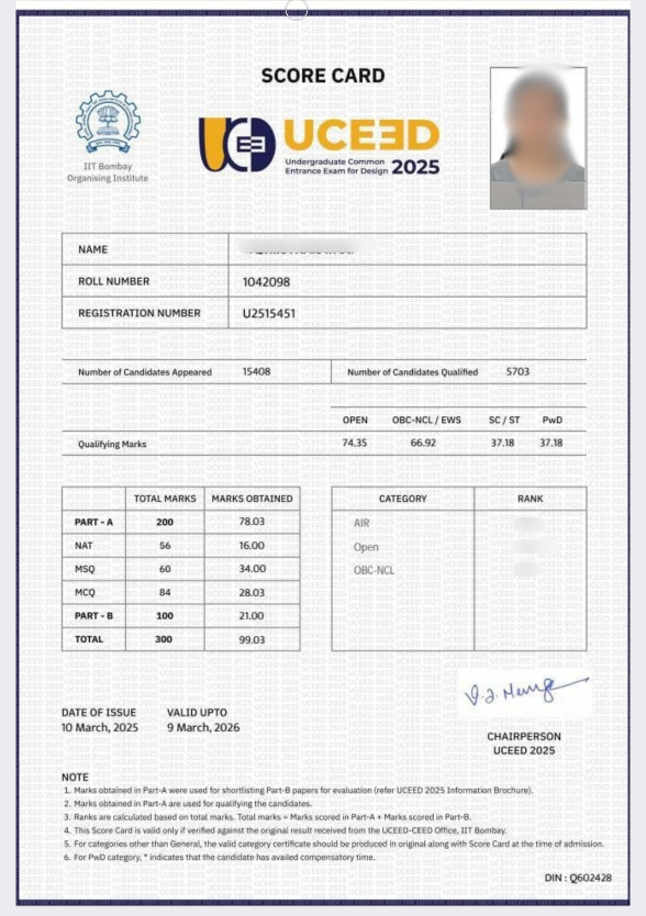 The UCEED exam result not only reflects your performance in Part A and Part B but also determines your All India Rank (AIR) and eligibility for the B.Des admission process. Those who qualify will have their name on the cut-off list and be called in for the next 3 rounds of the seat allotment process.
